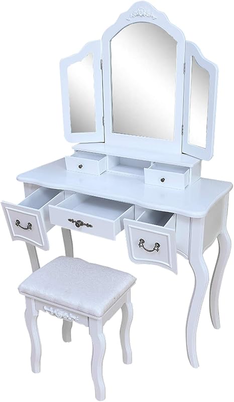 Amazon Com Dresser Kit Dressing Table Dresser Set With Tri Fold Mirror Dresser 5 Drawers 1 Vanity Stool Used For Bedroom Makeup Spa Dressing Room White Kitchen Dining