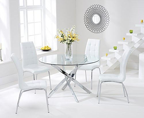 If it is a dinner party you want then it is a dinner party you shall have and have it on one of these fetching glass round dining table for 6. Buy online or visit Glassdiningtablescouk. STYLIFING Dining Table and Chairs Set Round Clear Glass Top Crisscrossing Chrome Metal Legs Kitchen Table and 4 Sled Based Grey Faux Leather Chairs Dining Set Home Kitchen Office Waiting Room Use.