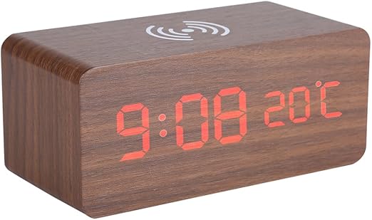 Amazon Com Fdit Wooden Alarm Clock Wood Led Digital Desk Clock Alarm Clocks With Voice Control Electronic Clock Wireless Charger With Time Date Temperature Display Brown Home Kitchen